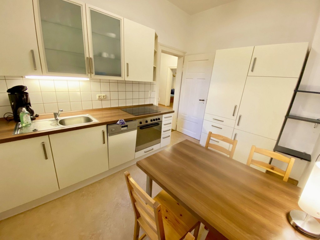 Die Küche ist voll ausgestattet mit Geschirrspüler und Gefrierfach, Cerankochfeld und Backofen, Wasserkocher, Filterkaffeemaschine.