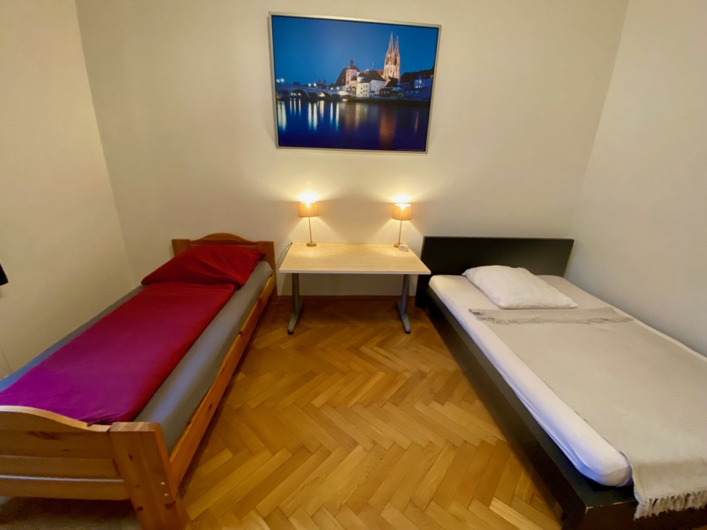 Im zweiten Zimmer stehen 2 Betten, eines 140 cm breit und eines 1 Meter breit, sowie ein Schreibtisch.