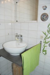 Bad mit Dusche und WC. Waschmaschine + Trockner.